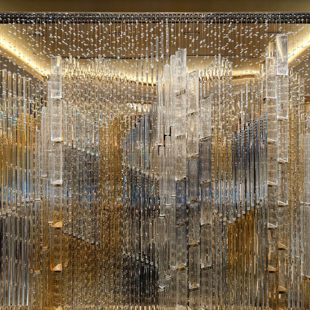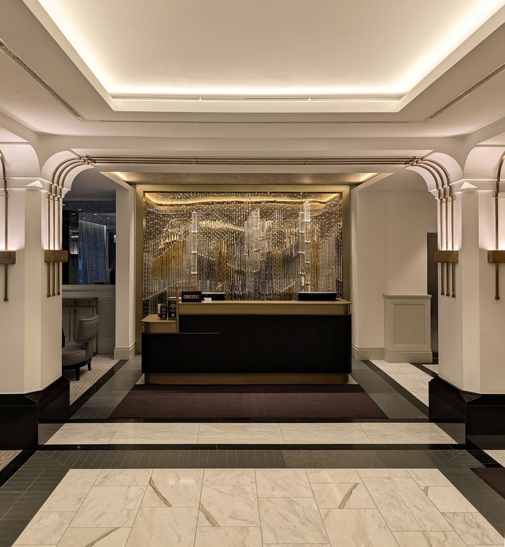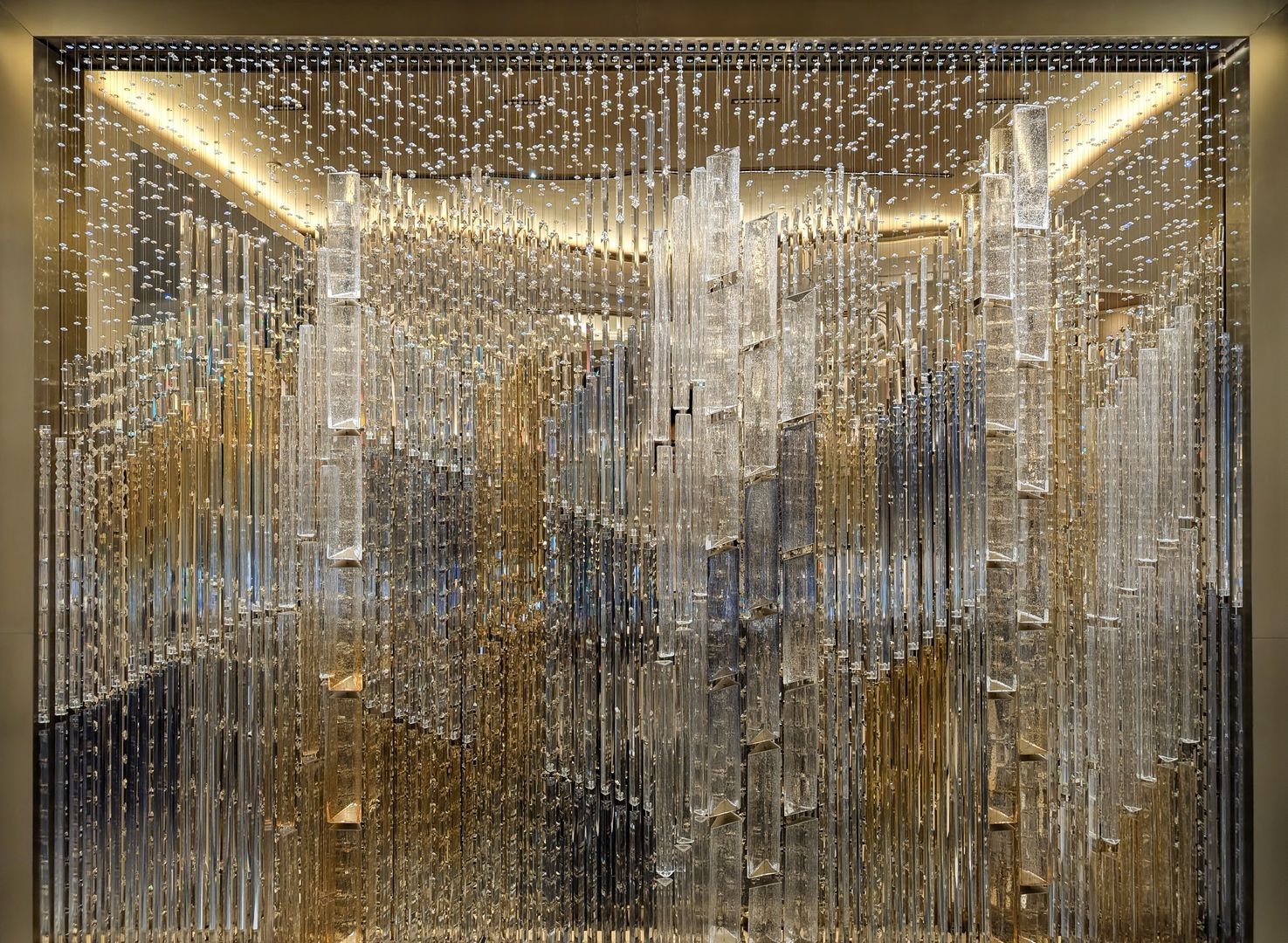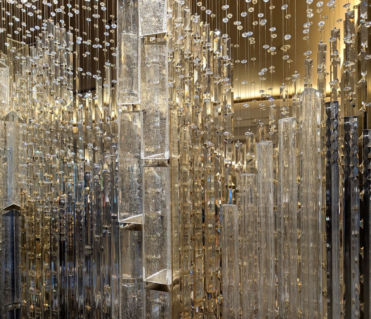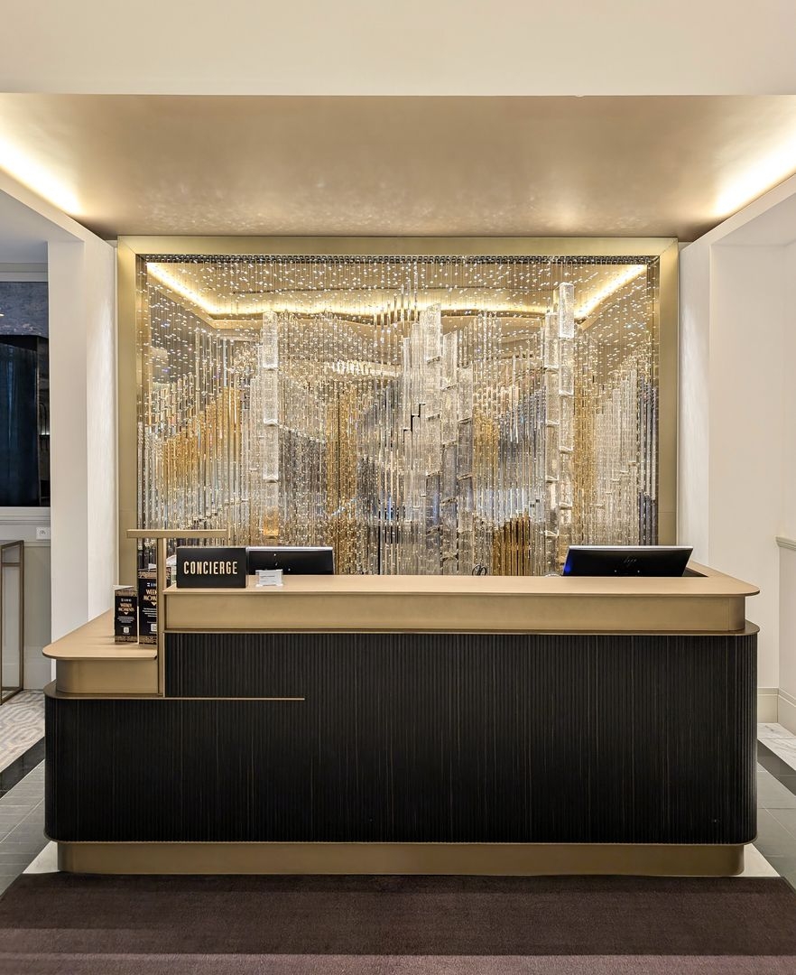 In the hotel’s reception area, carefully chosen handmade elements, suspended on fine wires, unite to create a composition reminiscent of a woven tapestry. In crystal, this composition reveals a singular vision of the city—woven from glass, light, and time.