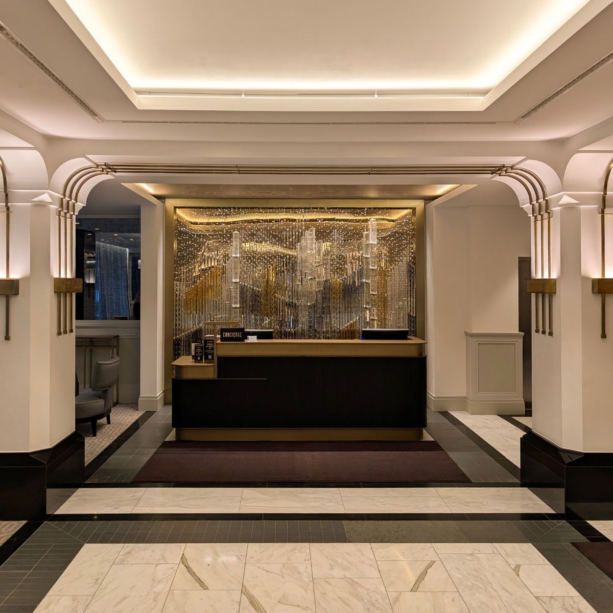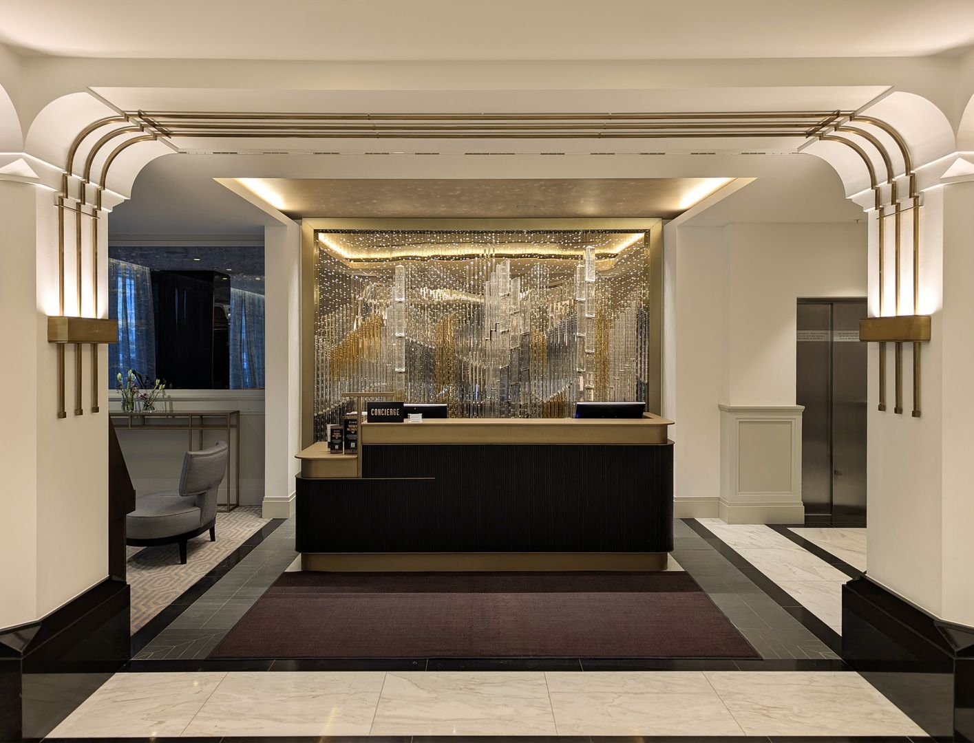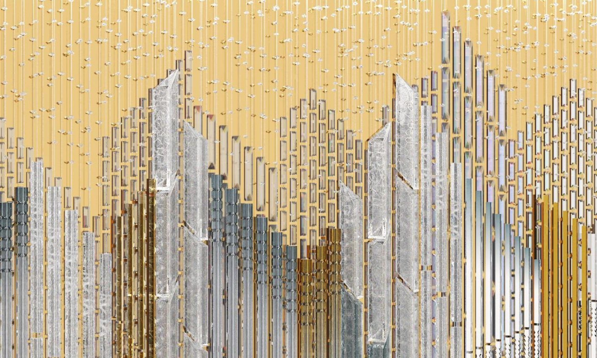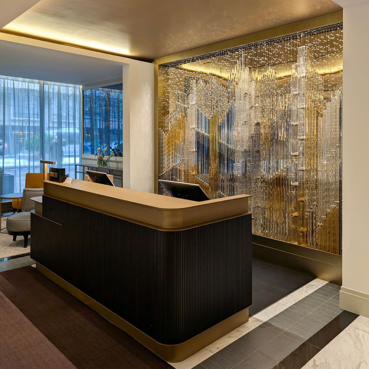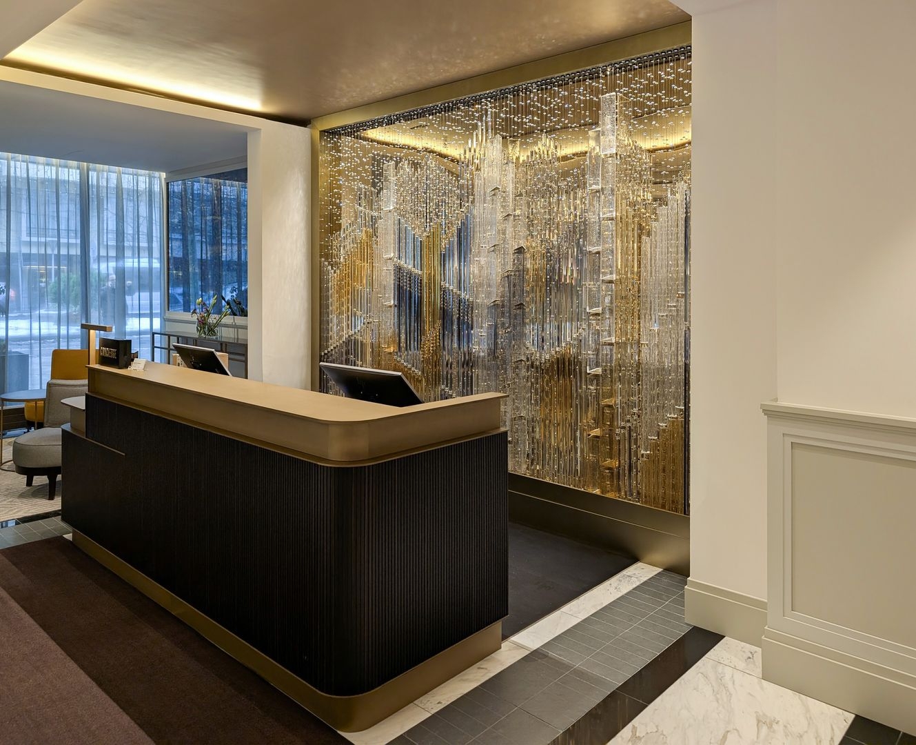 In the hotel’s reception area, carefully chosen handmade elements, suspended on fine wires, unite to create a composition reminiscent of a woven tapestry. In crystal, this composition reveals a singular vision of the city—woven from glass, light, and time.