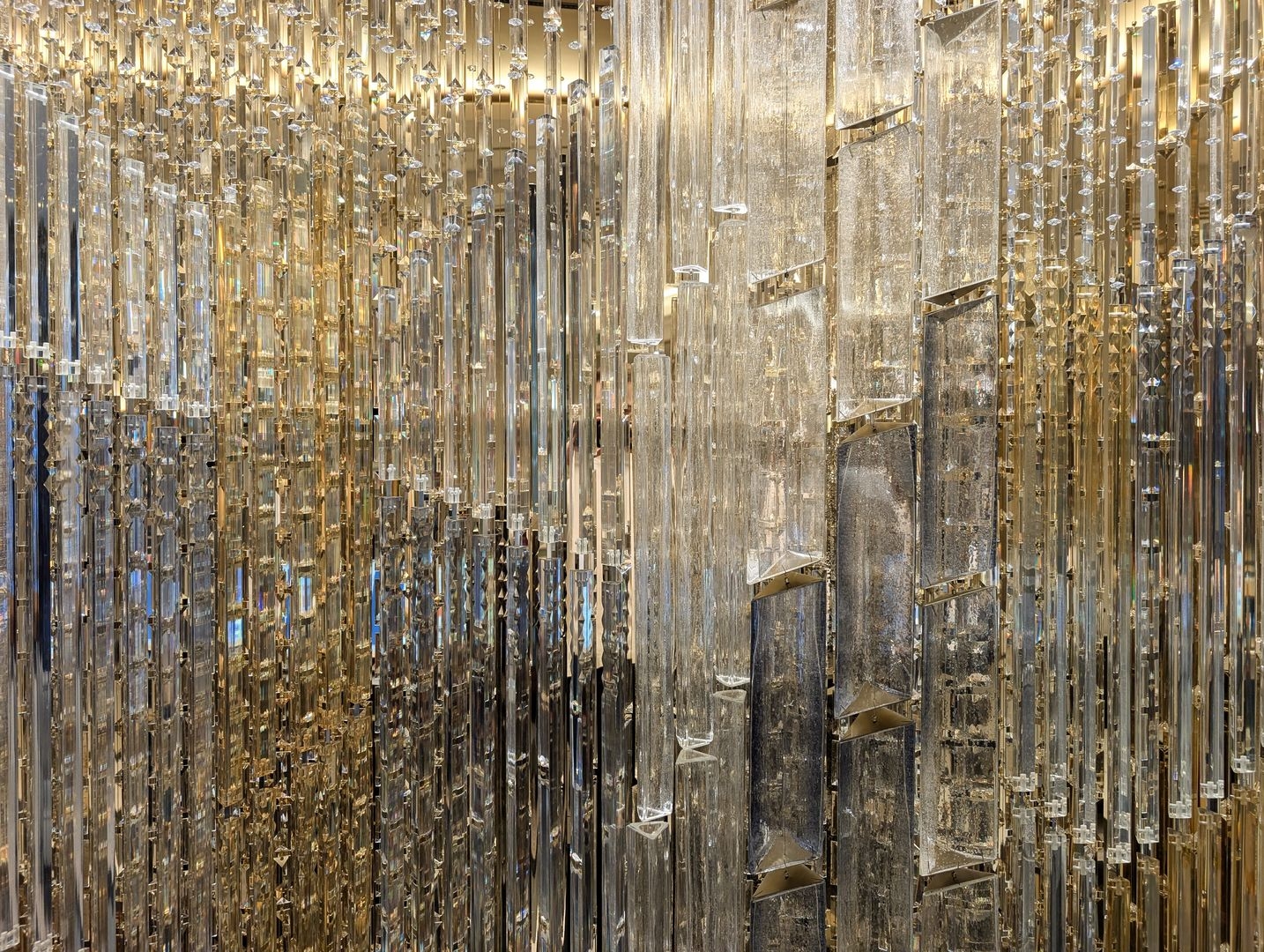 The installation glows through thousands of crystal pendants and hundreds of triangular glass prisms, each differing in size, colour, and pattern, and each meticulously hand-cut by Preciosa Lighting glassmakers in Kamenický Šenov.